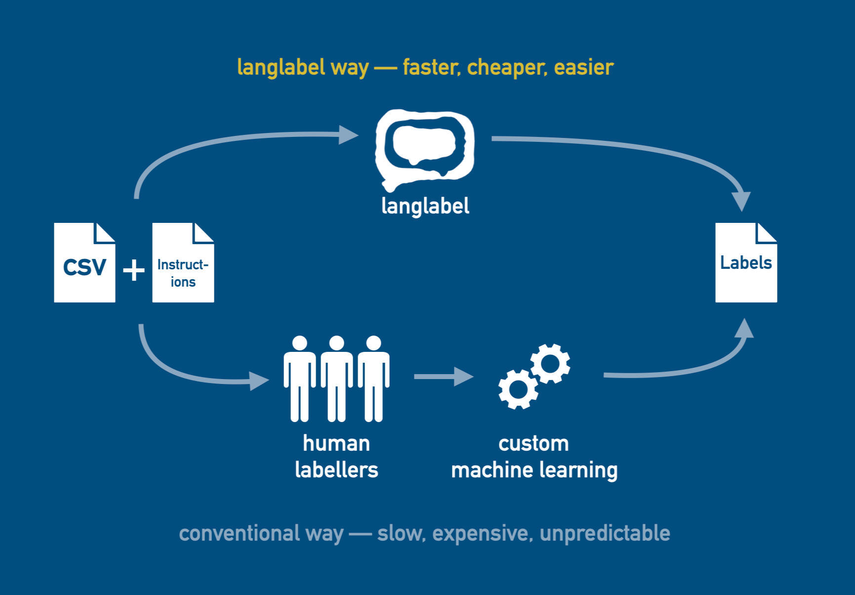 No more hiring human labellers and creating custom machine learning models – just upload your data as a .csv file together with instructions and get automatically generated labels. Without any additional human input. And no coding required.